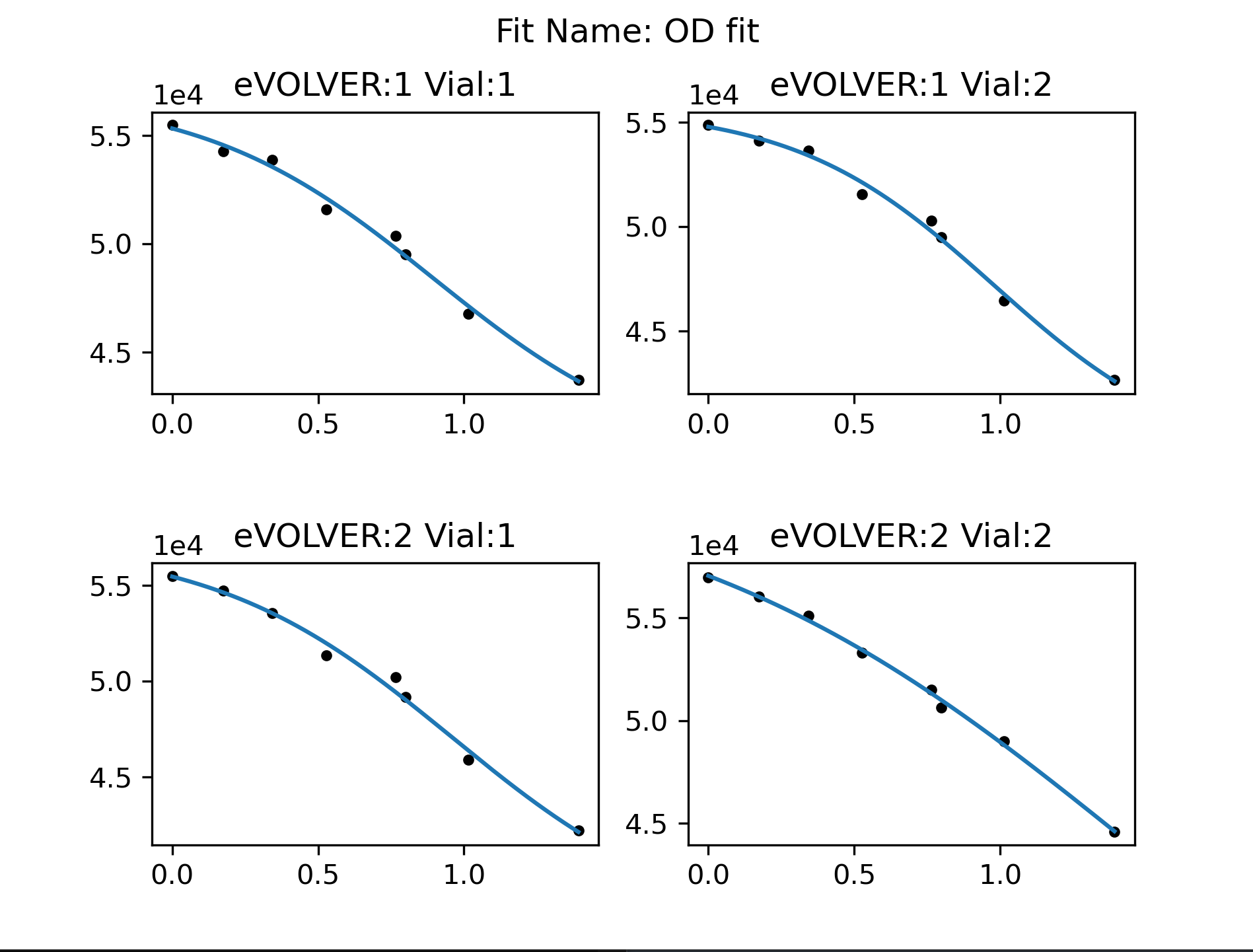 <figure><img src="https://3394537773-files.gitbook.io/~/files/v0/b/gitbook-x-prod.appspot.com/o/spaces%2FYy5AdmKzUTn7D8n357Md%2Fuploads%2FbCHUu5fW3eoprb2lu8HW%2Fimage.png?alt=media&#x26;token=25d810b3-be9f-4b00-ad04-582a0f90d549" alt=""><figcaption><p>Fitting curves to OD calibration data for two min-eVOLVERs. While there is some noise, standards generally follow the sigmoid function.</p></figcaption></figure>